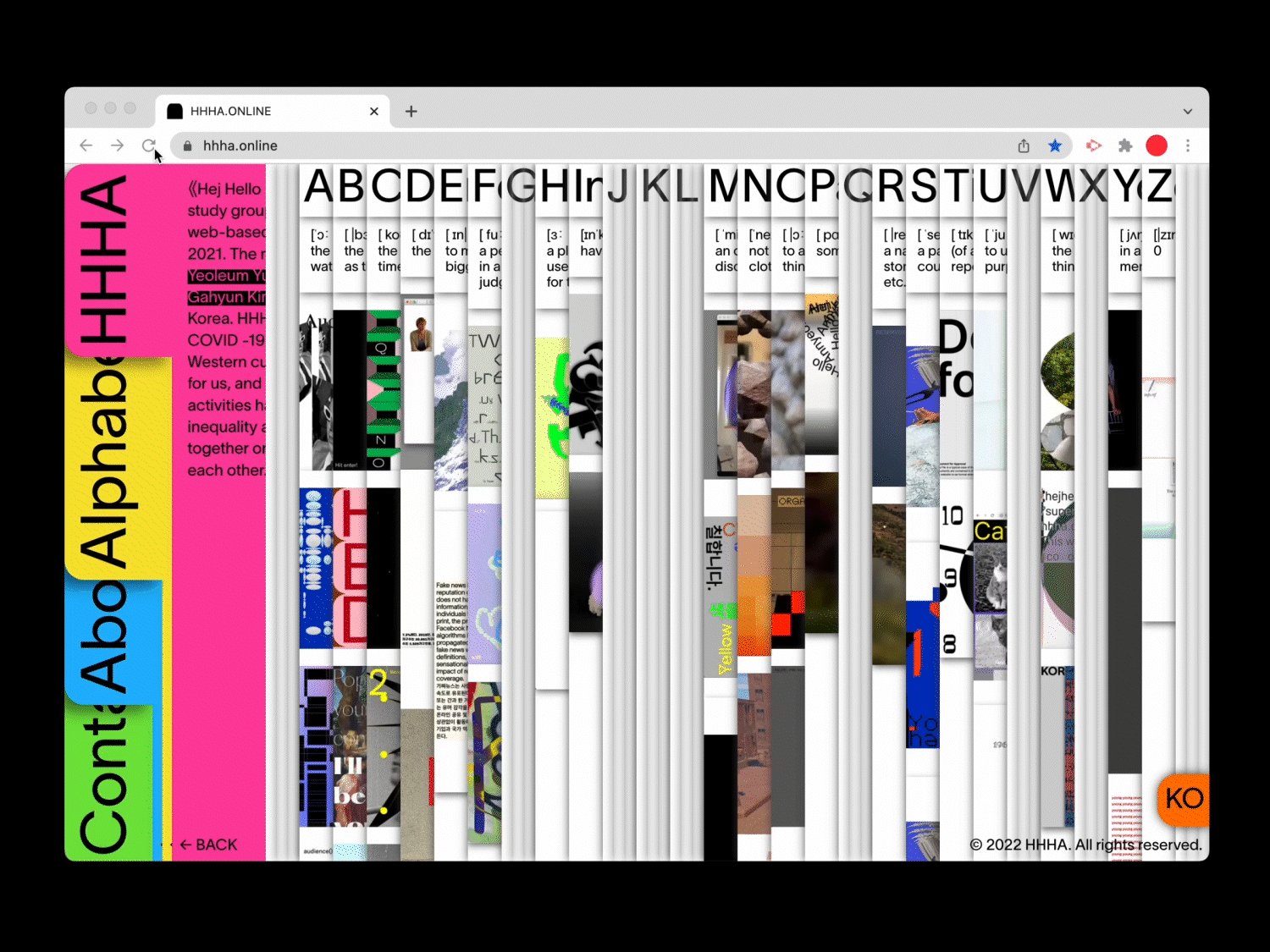 《Hej Hello Hallo Annyeong》 (hereafter referred to as HHHA) is a study group where female creators gather to share and explore web-based works. HHHA was founded by online communication in the era of COVID -19. In the untact era that began in 2020, surviving in Western culture as an Asian woman has become a very difficult task for us, and accessing networks and virtual worlds for social activities has become indispensable. In a situation where gender inequality and racial inequality is worsening, we are working together on the net to break down barriers and communicate with each other.