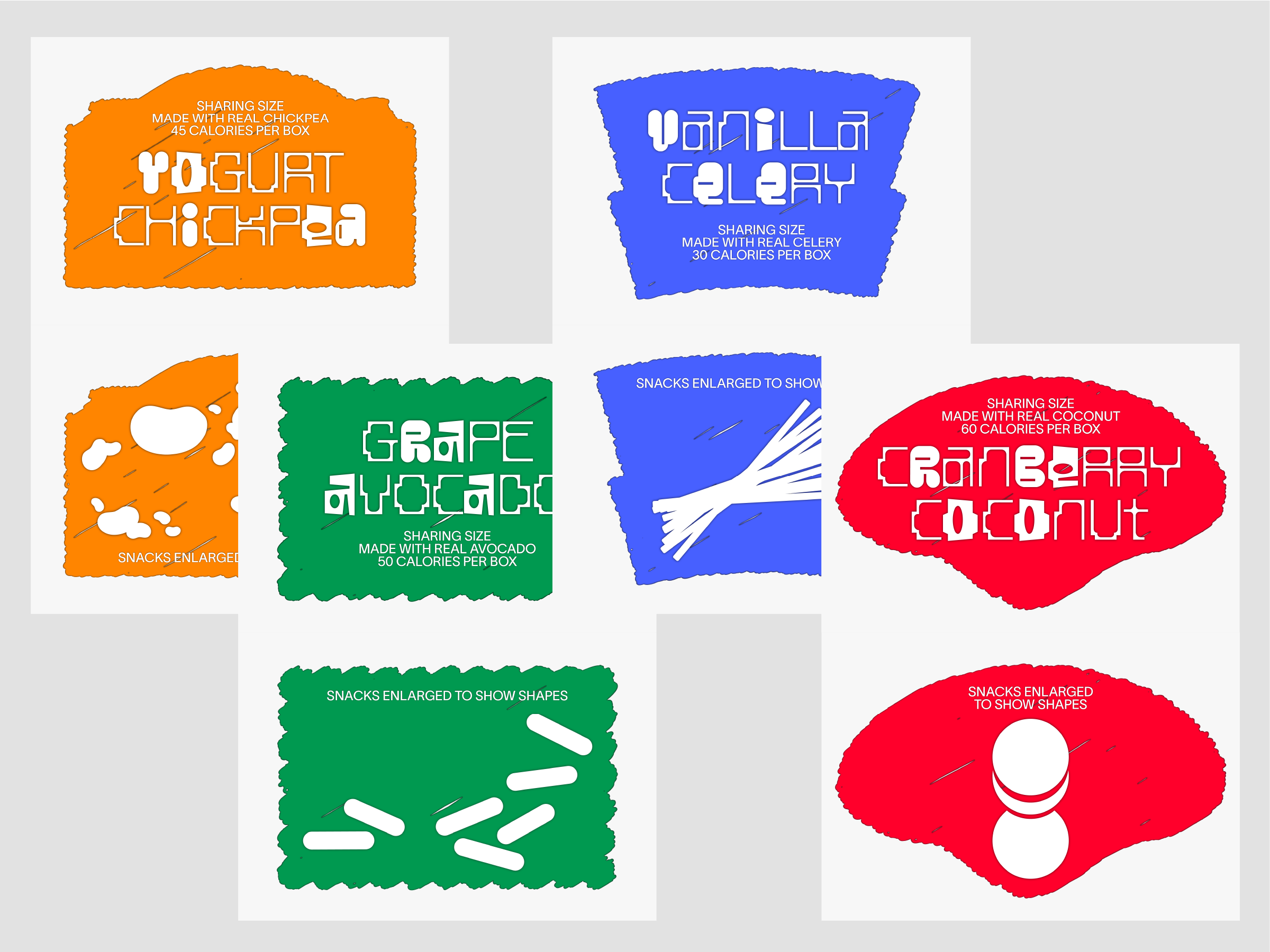 We often face dilemmas in the supermarket. Because the fun and colorful designs of the snack corner catch the eyes of everyone, especially children. But can’t these playful designs be used for better snacks that aren’t unhealthy processed foods? These concerns inspired this project. One study found that over 50% of a chosen group of children chose broccoli when given a normal-looking chocolate bar and broccoli with a cute character on it. In this way, I thought designers can make the world a better place. So I wanted to use the eye-catching graphic elements of the existing snack designs to make new kinds of snacks with better intentions. For that process, I made a list of 80 snacks collected from the US, Europe, Japan, and South Korea and conducted a research. Simplified graphic elements, mascot faces, and colors were extracted from the existing packages, and three different fonts were created for new snack packages. Each of the three different fonts are made using a grid system, in order for them to be uniform even on a design. All the created graphics consist of graphic elements extracted from the existing snack packages.