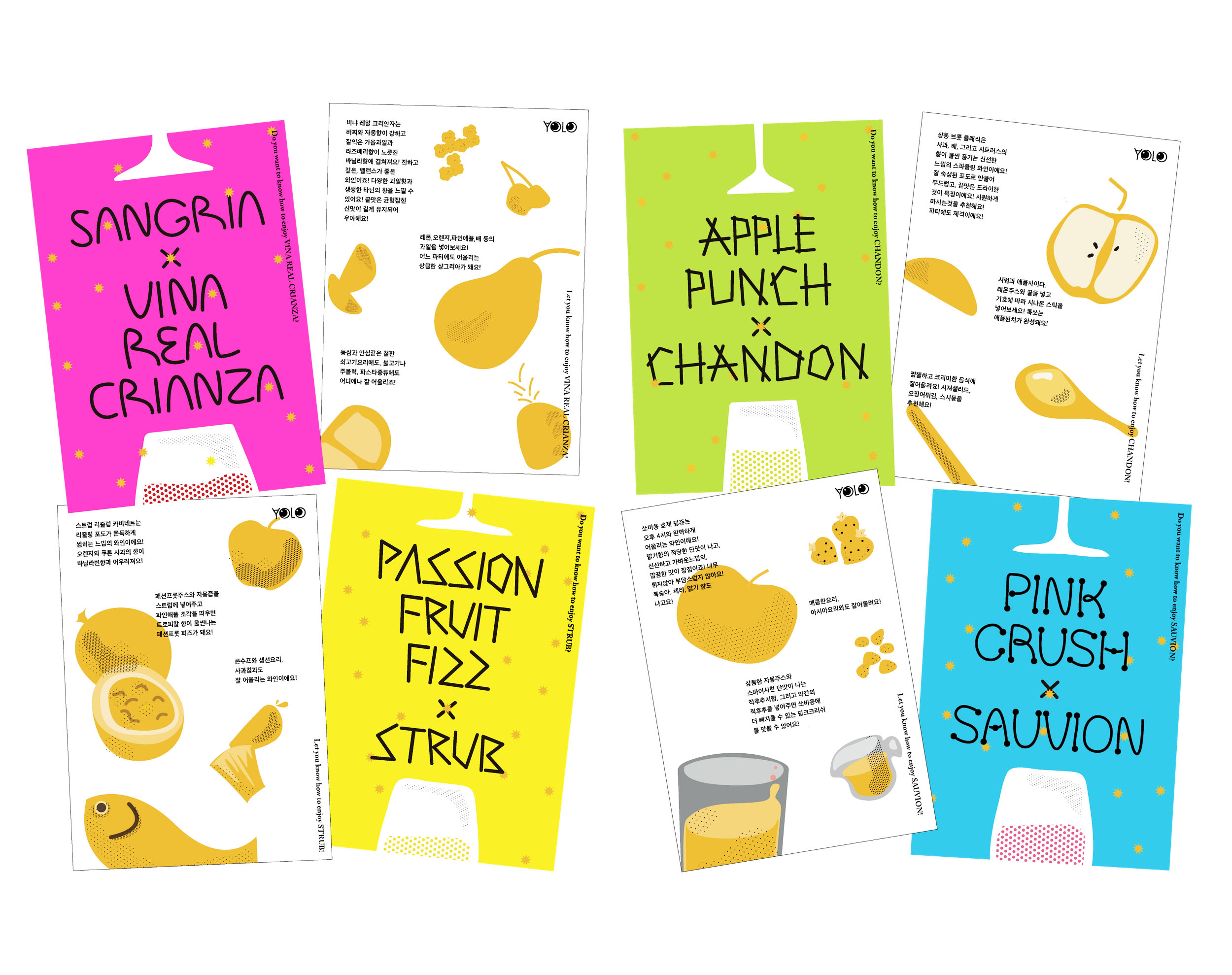 Young Koreans usually think that wine is an expensive and high-end drink, so it is not often bought. The wine retail brand was planned for them so that the younger population can have access to wine without having to pay high prices. Each type of wine has its own color, label and character. This makes it easier to distinguish and characterize the wines. Each type of wine also has a recipe card for a wine cocktail that can be made with that wine. These recipe cards were printed by Riso Printing.