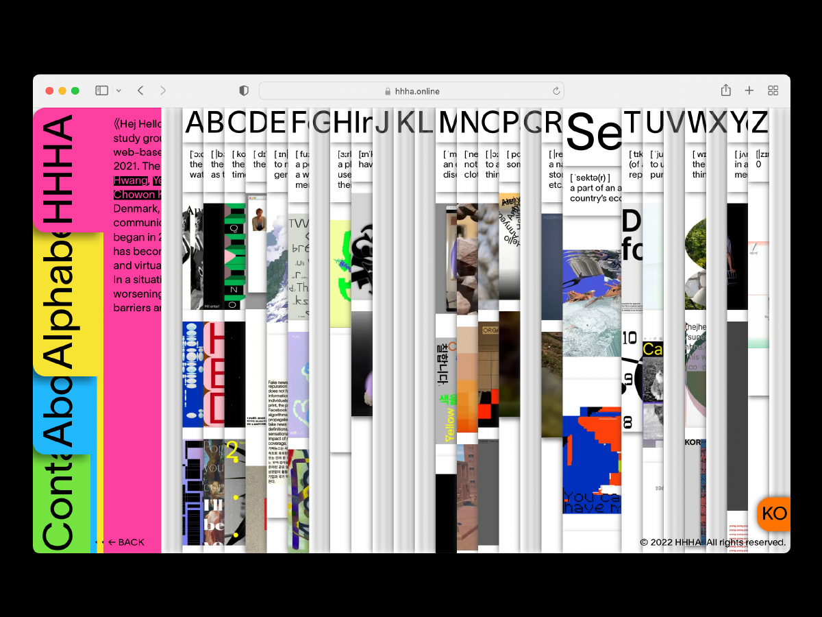 《Hej Hello Hallo Annyeong》 (hereafter referred to as HHHA) is a study group where female creators gather to share and explore web-based works. HHHA was founded by online communication in the era of COVID -19. In the untact era that began in 2020, surviving in Western culture as an Asian woman has become a very difficult task for us, and accessing networks and virtual worlds for social activities has become indispensable. In a situation where gender inequality and racial inequality is worsening, we are working together on the net to break down barriers and communicate with each other.