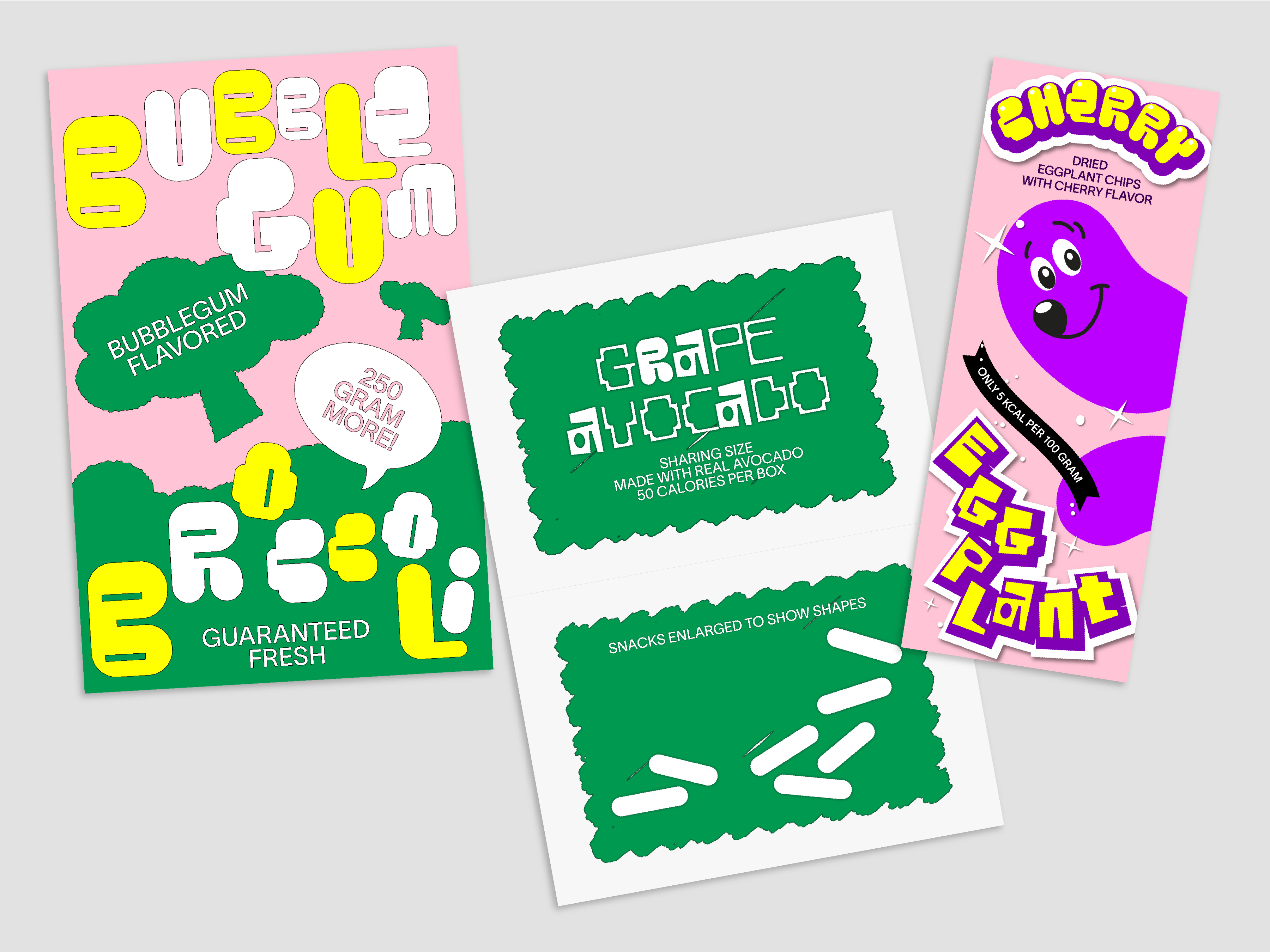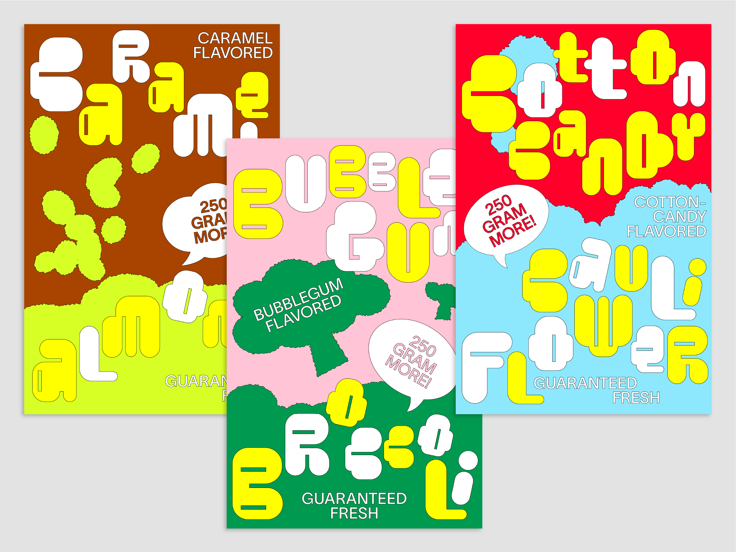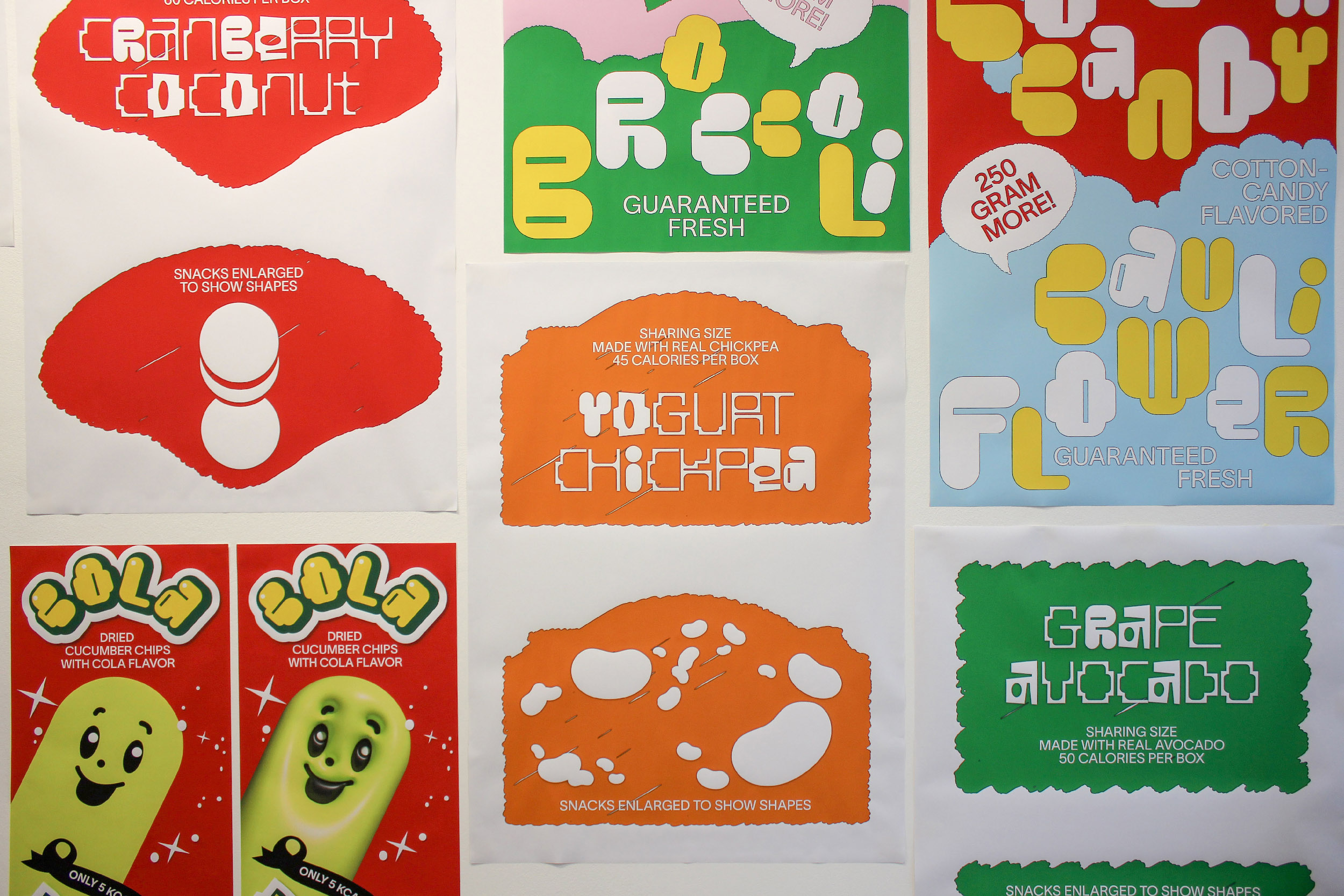 We often face dilemmas in the supermarket. Because the fun and colorful designs of the snack corner catch the eyes of everyone, especially children. But can’t these playful designs be used for better snacks that aren’t unhealthy processed foods? These concerns inspired this project. One study found that over 50% of a chosen group of children chose broccoli when given a normal-looking chocolate bar and broccoli with a cute character on it. In this way, I thought designers can make the world a better place. So I wanted to use the eye-catching graphic elements of the existing snack designs to make new kinds of snacks with better intentions. For that process, I made a list of 80 snacks collected from the US, Europe, Japan, and South Korea and conducted a research. Simplified graphic elements, mascot faces, and colors were extracted from the existing packages, and three different fonts were created for new snack packages. Each of the three different fonts are made using a grid system, in order for them to be uniform even on a design. All the created graphics consist of graphic elements extracted from the existing snack packages.