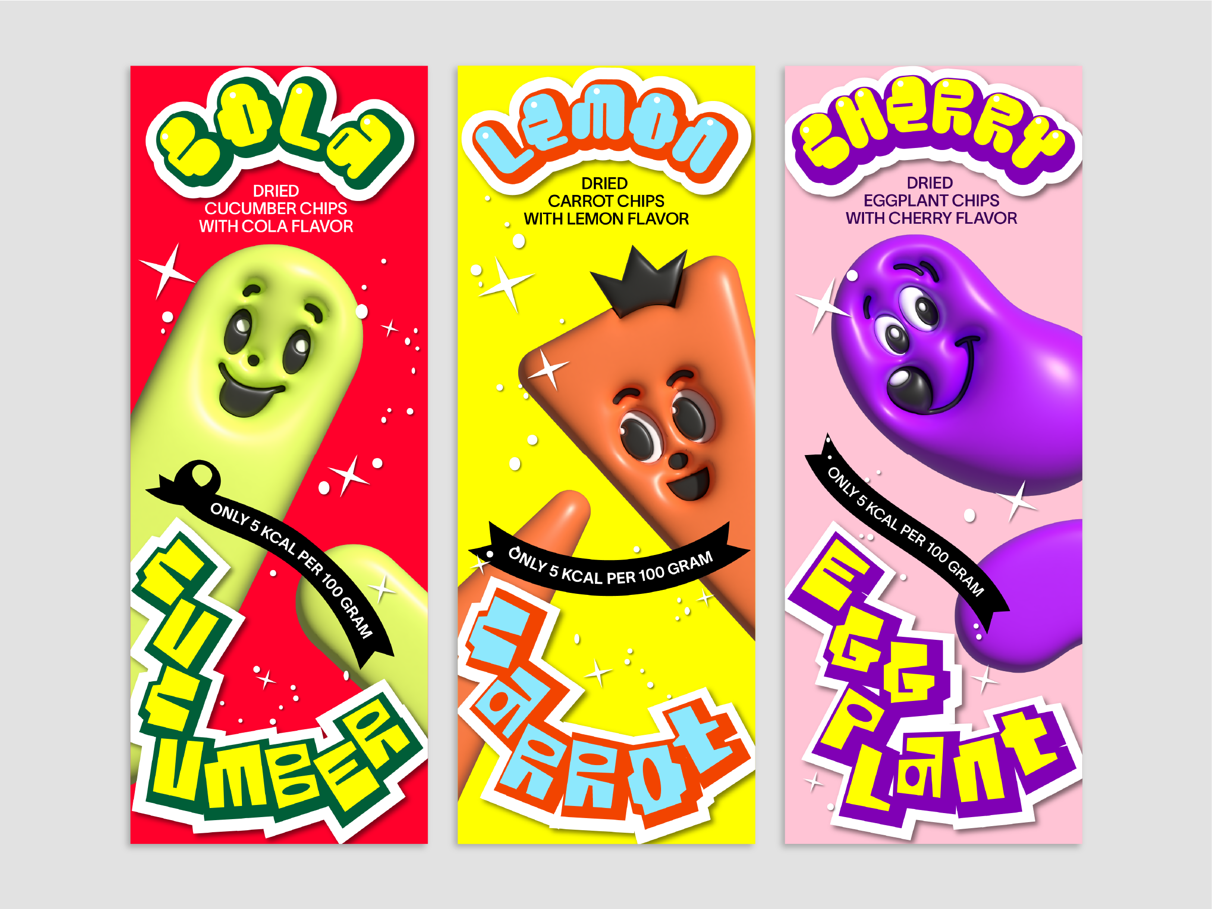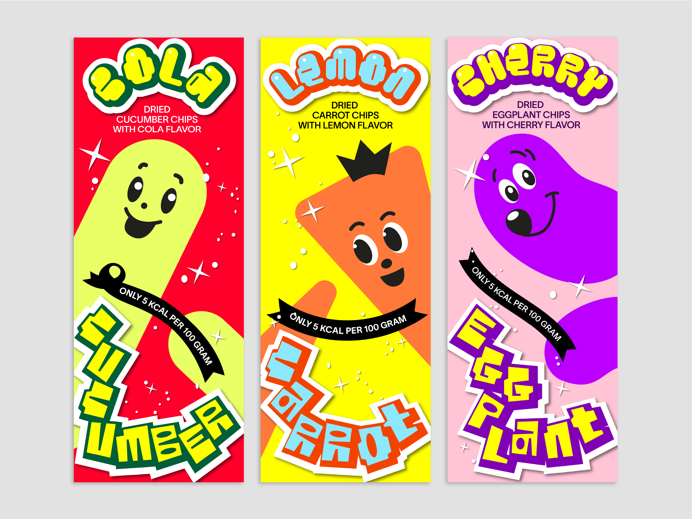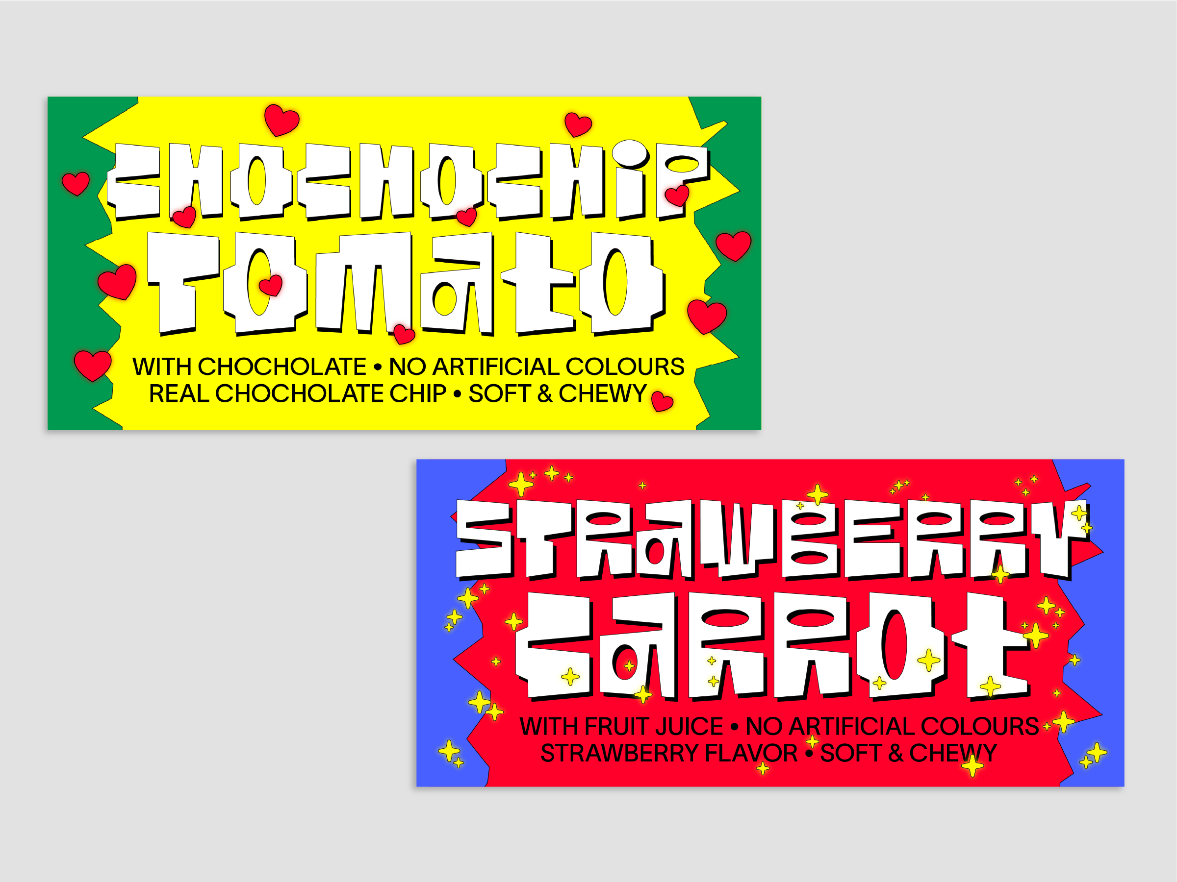 We often face dilemmas in the supermarket. Because the fun and colorful designs of the snack corner catch the eyes of everyone, especially children. But can’t these playful designs be used for better snacks that aren’t unhealthy processed foods? These concerns inspired this project. One study found that over 50% of a chosen group of children chose broccoli when given a normal-looking chocolate bar and broccoli with a cute character on it. In this way, I thought designers can make the world a better place. So I wanted to use the eye-catching graphic elements of the existing snack designs to make new kinds of snacks with better intentions. For that process, I made a list of 80 snacks collected from the US, Europe, Japan, and South Korea and conducted a research. Simplified graphic elements, mascot faces, and colors were extracted from the existing packages, and three different fonts were created for new snack packages. Each of the three different fonts are made using a grid system, in order for them to be uniform even on a design. All the created graphics consist of graphic elements extracted from the existing snack packages.