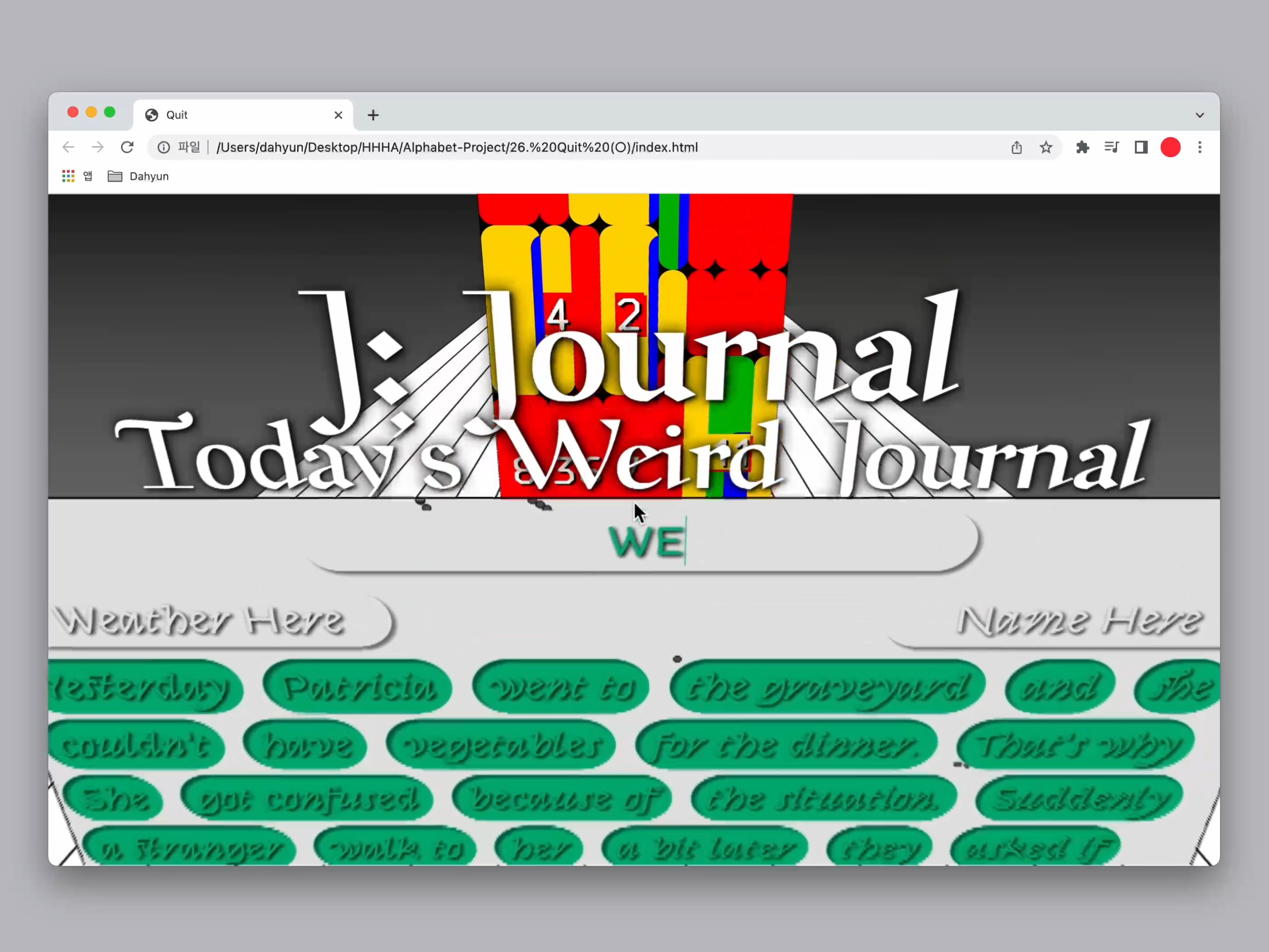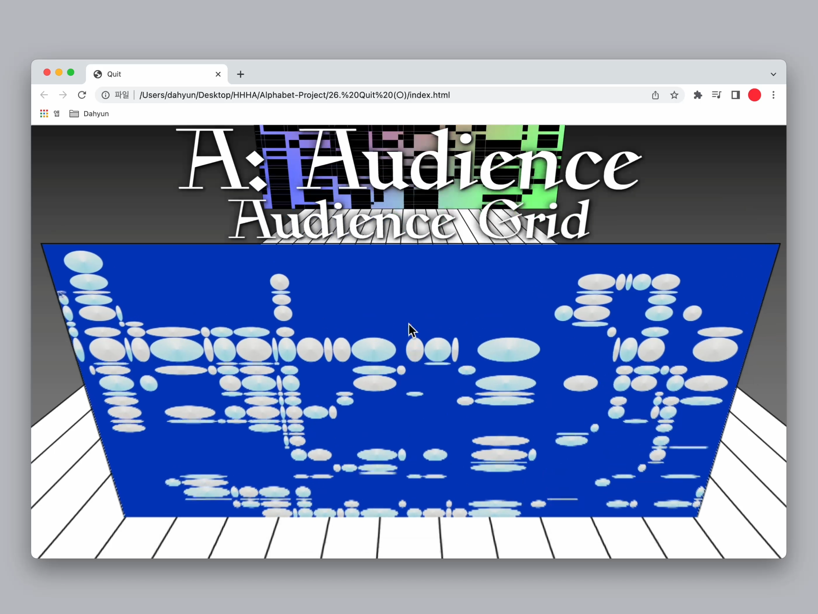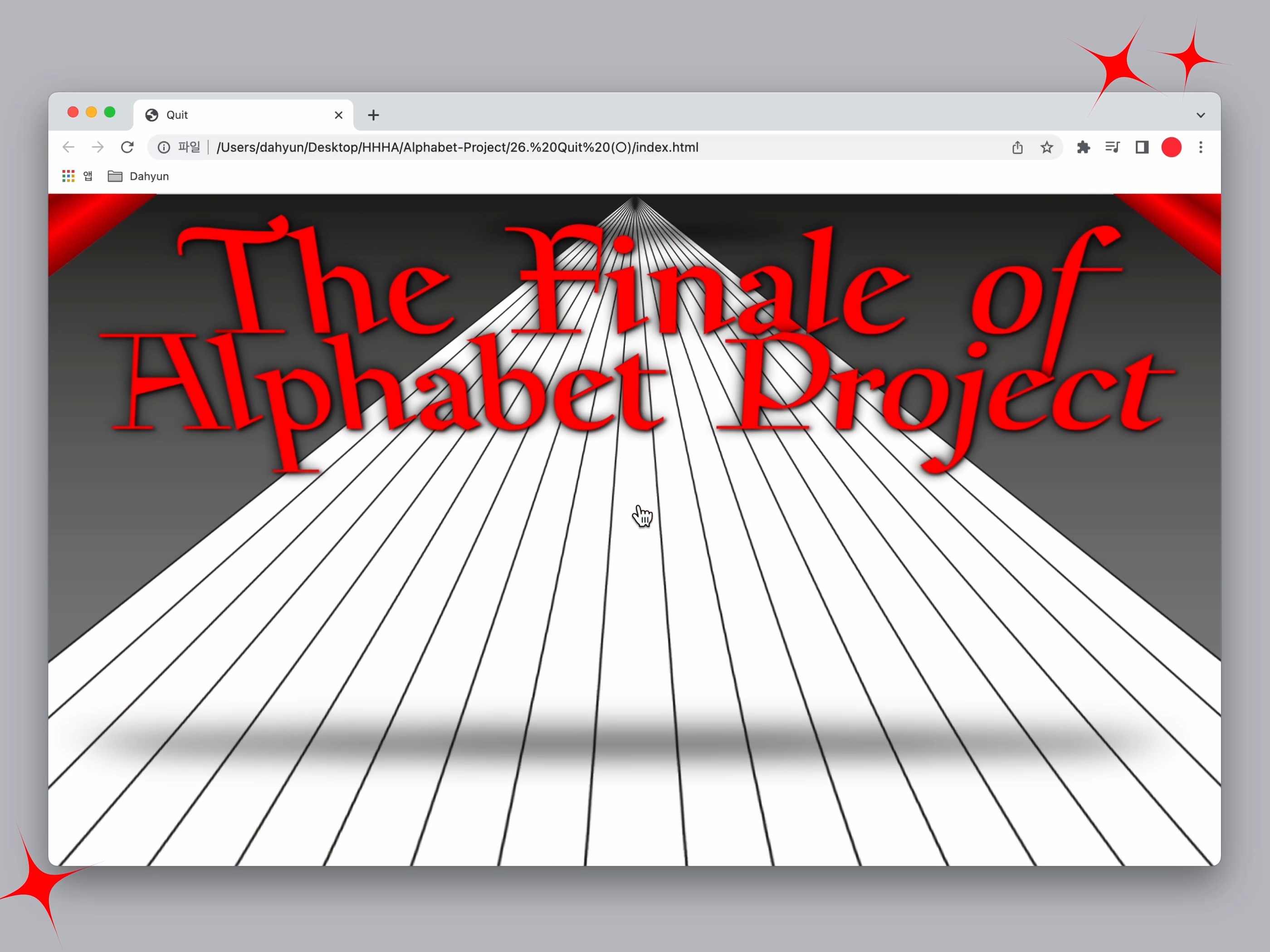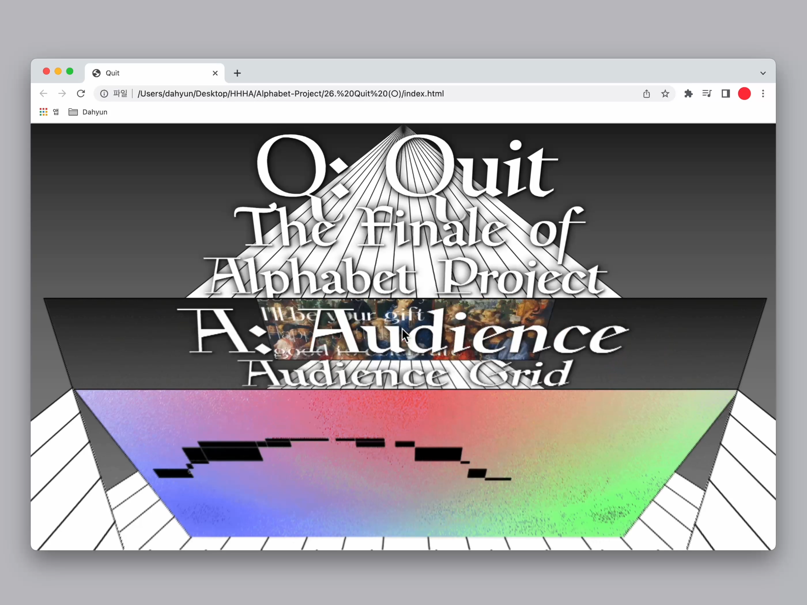 HHHA’s alphabet project has been completed with 26 alphabets. Therefore, I made a grand finale for the last word 〈Quit〉. When you click on the red curtain, the curtain opens, and when scrolling, the projects I’ve created for the alphabet project enter the stage one after another.